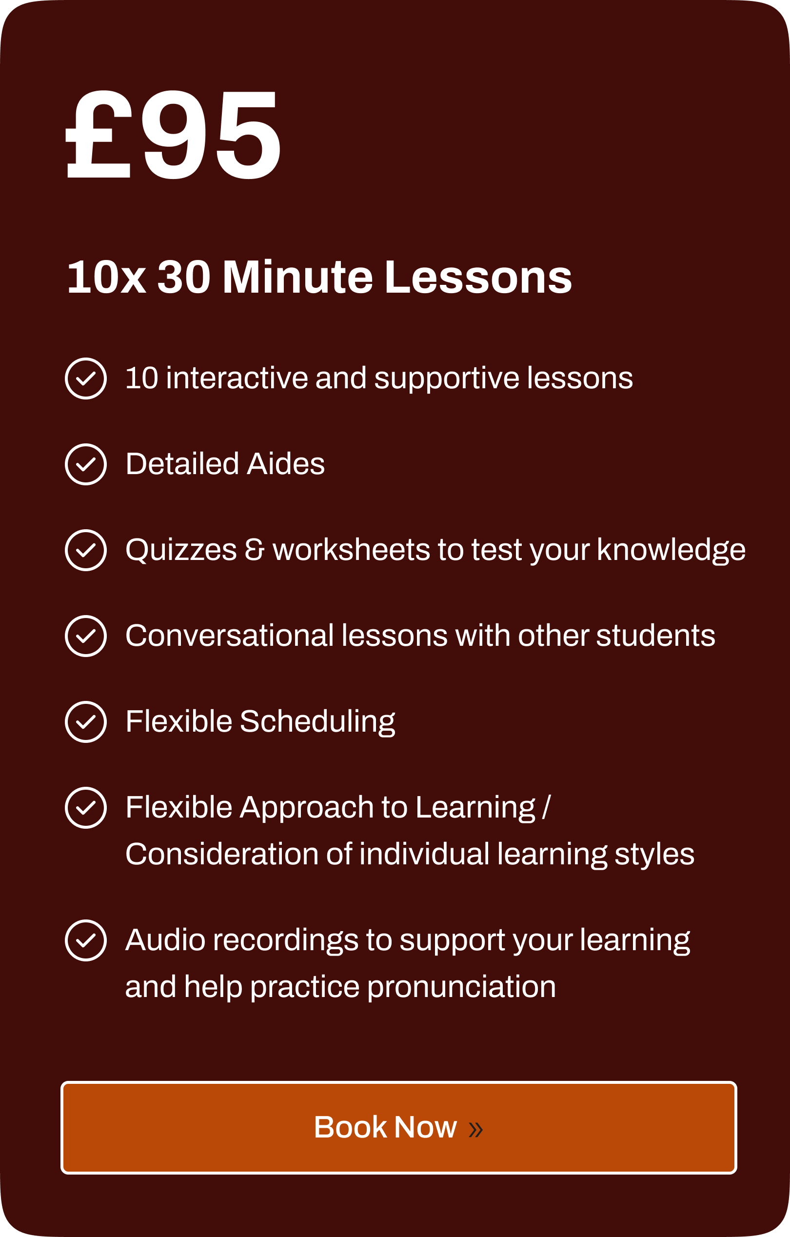 30 – 45 minute sessions. Larger groups, please register your interest and you will be notified once there are enough people in the class.